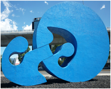 SOL; Con influencias de la cultura prehispánica de nuestro país, el japonés Kioshi Takahashi diseñó dos esferas de 7 metros de altura. Como vez en la imagen, las esferas no están enteras pero cuando los autos viajan a una alta velocidad, la ilusión óptica hace que parezcan completas.